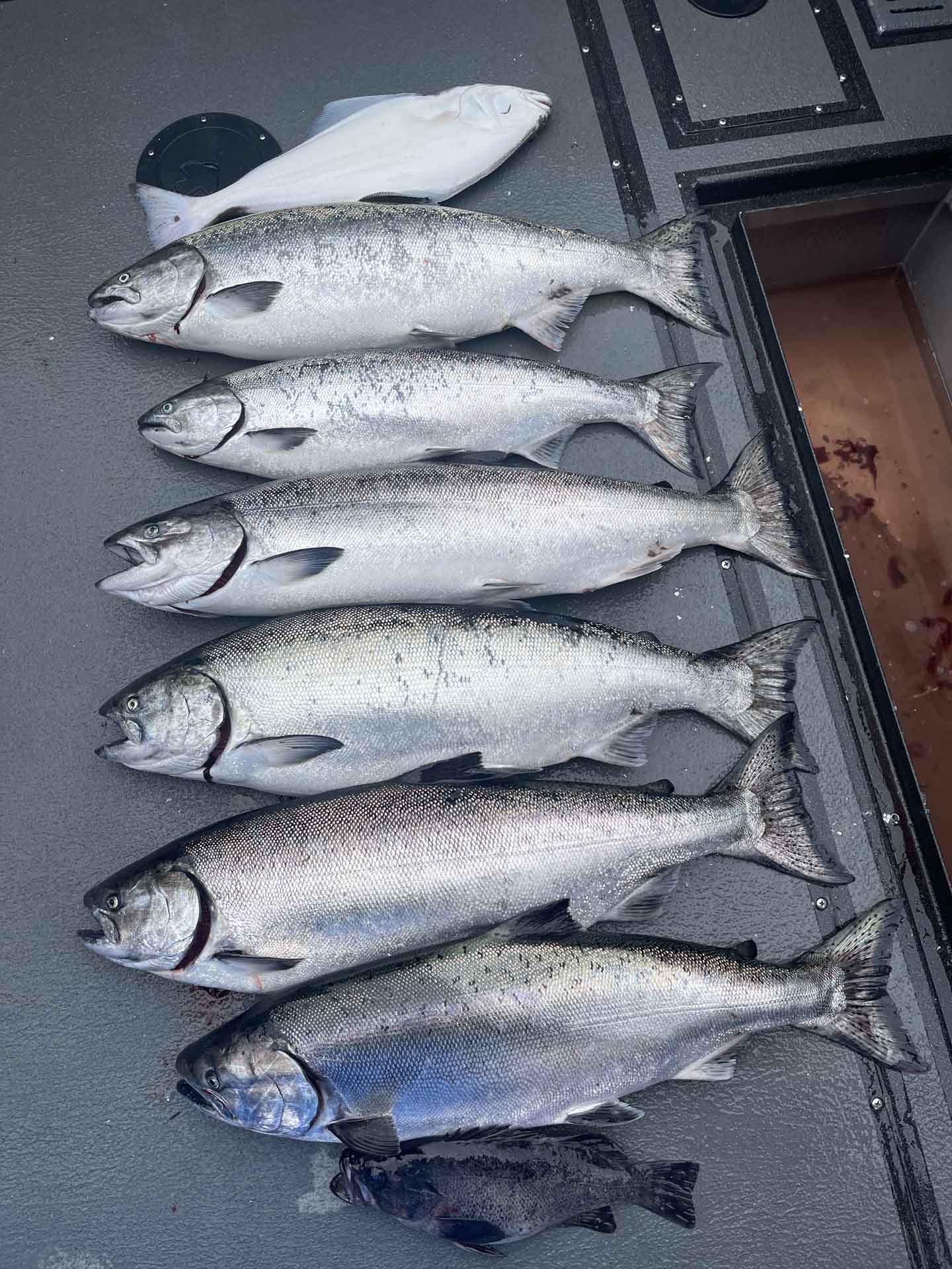 During your trip, we’ll plan to fish for king salmon, silver salmon, halibut, lingcod, rockfish, and black bass. For the salmon, we can either mooch or troll with downriggers. For the halibut, lingcod, rockfish, and black bass, we will drop bait to the bottom and jig.